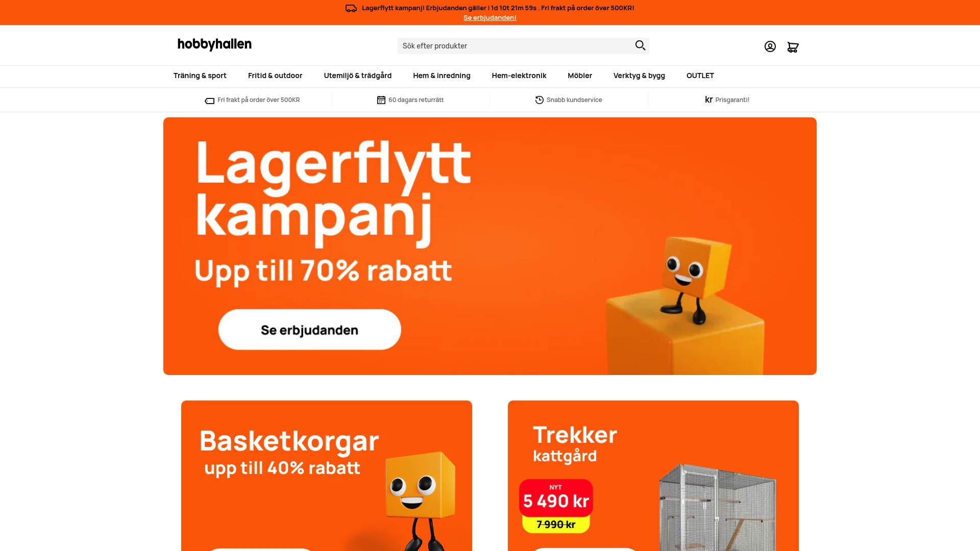 Hobbyhallen erbjuder kategorier för disc golf, kampsport, fitness, friluftsutrustning och heminredning vilket gör webbplatsen användbar för många intressen. Webbplatsen lyfter fram frekventa erbjudanden och en tydlig leverans och returpolicy.