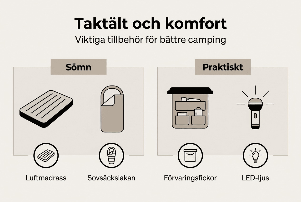 | Komforttillbehör | Luftmadrasser, innertält och förtält förbättrar isolering, utrymme och sovkvalitet avsevärt |