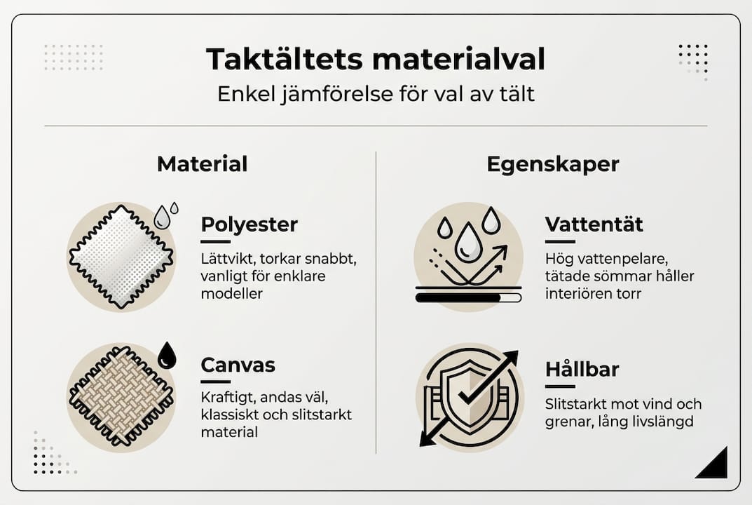 Materialet avgör hur länge taktältet håller och hur väl det skyddar dig i dåligt väder. De vanligaste materialen är polyester, canvas och ABS-plast eller aluminium för hardshell-modeller.